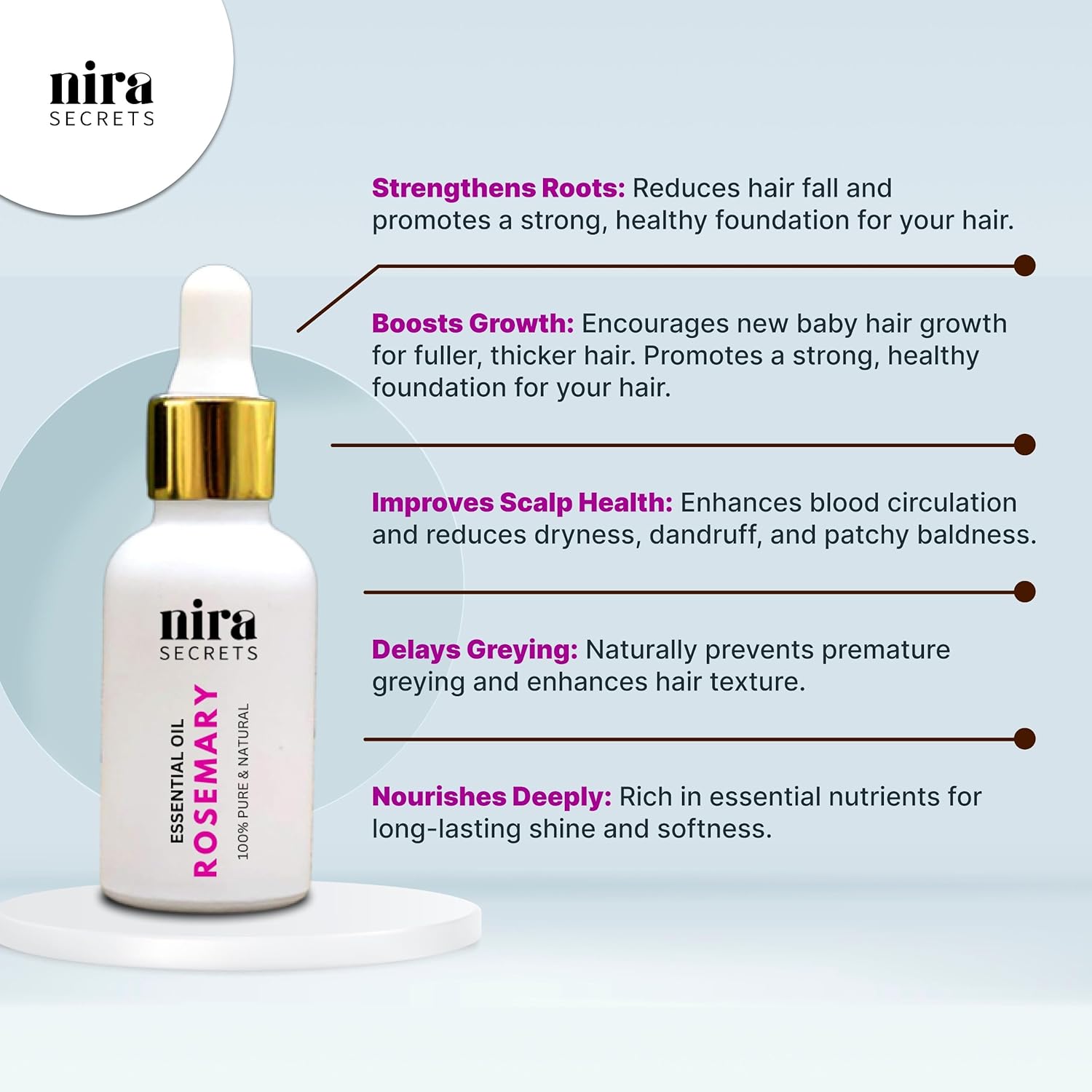 Experience the power of 100% pure Rosemary Essential Oil for faster hair growth, reduced hair fall, and a healthier scalp with Nira Secrets. This therapeutic-grade oil is packed with natural nutrients that strengthen hair follicles, improve scalp circulation, and deeply nourish hair from root to tip. 🔹 No Parabens, No Sulfates, No Silicones – Just 100% pure, undiluted rosemary oil for maximum benefits. Why Choose Nira Secrets? ✔ Premium-grade pure rosemary oil ✔ Ideal for all hair types – men & women ✔ Safe for regular use – No parabens, sulfates, or silicones ✔ Multipurpose use: Hair, scalp, skin, and aromatherapy 💡 How to Use: For Hair: Mix a few drops with a carrier oil and massage into scalp. For Aromatherapy: Add a few drops to a diffuser or humidifier. For Skin: Dilute with a carrier oil before applying.