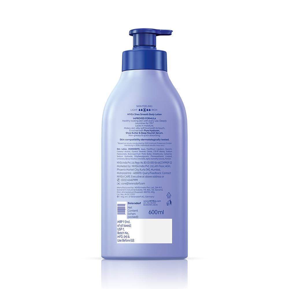 NIVEA Shea Smooth Body Lotion is enriched with Shea Butter and Pure Hyaluron (Hyaluronic Acid) to provide up to 72 hours of deep hydration for noticeably smoother, healthier skin. Its Deep Moisture Formula penetrates deeply to lock in hydration, restore softness, and protect against dryness caused by daily stressors. From the very first application, skin feels soft, supple, and nourished without any greasy residue—just lasting smoothness and comfort. Designed to care for extra dry and sensitive skin, this lotion helps maintain the skin’s natural moisture barrier while giving it a healthy glow. Key Benefits: Long-lasting 72Hr hydration with Pure Hyaluron (Hyaluronic Acid) Restores skin smoothness with Shea Butter Lightweight, fast-absorbing, non-greasy finish Ideal for daily use to prevent dryness and roughness Target Audience: Unisex, suitable for all skin types NIVEA – A hundred years of skincare for life!