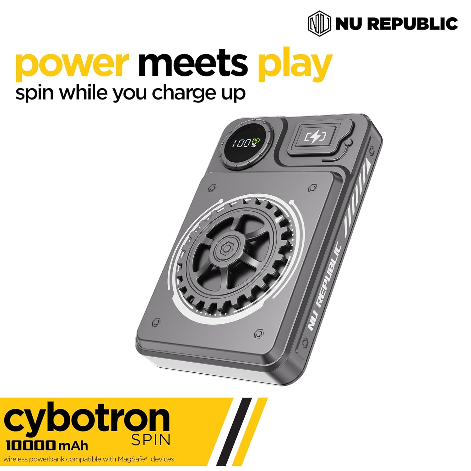 supercharge your devices with the latest Nu Republic’s cybotron SPIN power bank, loaded with an impressive 10,000 mAh battery. featuring magnetic wireless charging, and Nu Republic’s exclusive Powerblitz ™ technology, the cybotron SPIN guarantees super-fast and precision charging for all your gears.