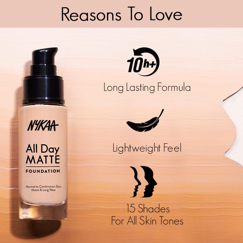 Discover flawless coverage that lasts all day with Nykaa All Day Matte Foundation. This innovative liquid foundation delivers a luxurious, velvety matte finish while feeling incredibly lightweight on your skin. Perfect for normal to combination skin types, it provides seamless coverage that stays put for up to 10 hours without the need for touch-ups. Available in 15 versatile shades including Vanilla 02, this foundation adapts beautifully to diverse Indian skin tones. The sophisticated formula glides on smoothly, creating a natural second-skin effect that helps even out your complexion. Its long-wearing properties make it ideal for extended wear during work hours or special occasions. The 30ml bottle comes with a convenient pump dispenser for precise application. Experience the perfect balance of coverage and comfort with this mattifying foundation that keeps you looking fresh and polished throughout your busy day.