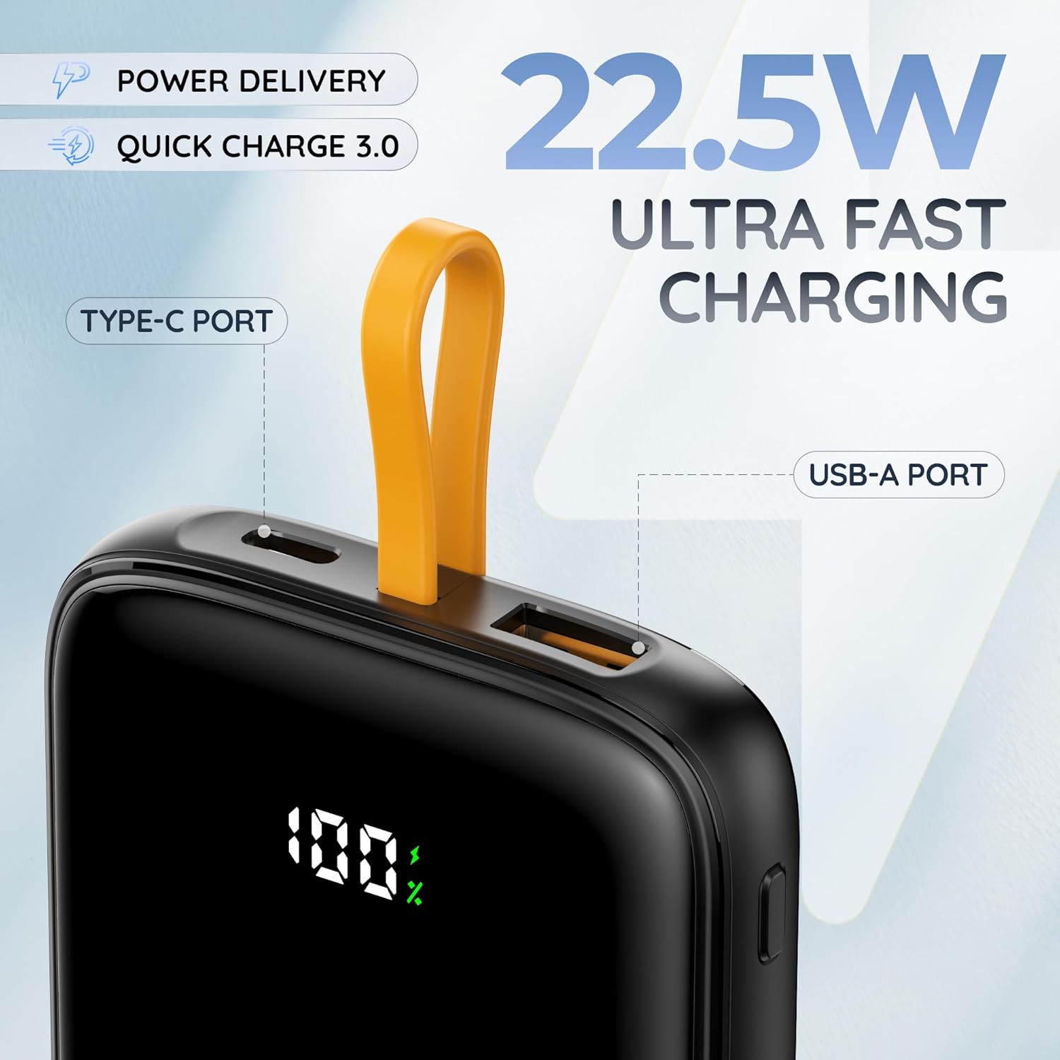 VERSATILE CONNECTIVITY: Comes with an inbuilt charging cable, Type-C port, and USB-A port for simultaneous multi-device charging