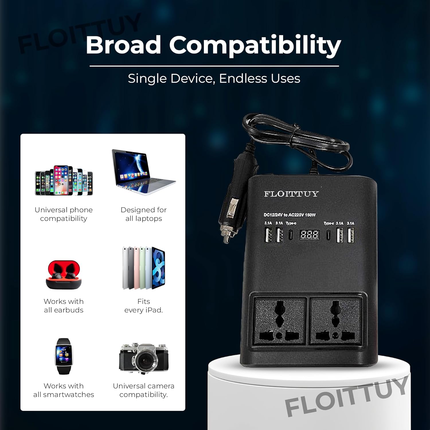 Portable Car Power Inverter/Laptop Charger with LED Display | Car Socket to Plug Adapter | 12V DC to 220V AC Socket Converter | 4 USB+2 3Pin Plug+2 Type-C for Laptop,Mobile,Other(1)