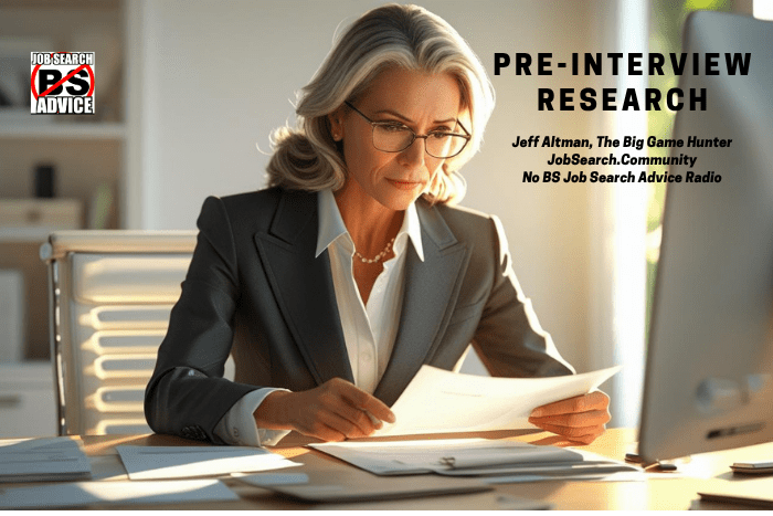 I’m the head coach for JobSearch.Community. I can’t believe I haven’t done this subject before. In all these years, I haven’t done a video about pre-interview research. Well, I’m going to do it now and the long of the short of it is less experienced people minimize the importance of pre-interview research and for those of you who are more experienced, you know how useful it can be to your preparation.