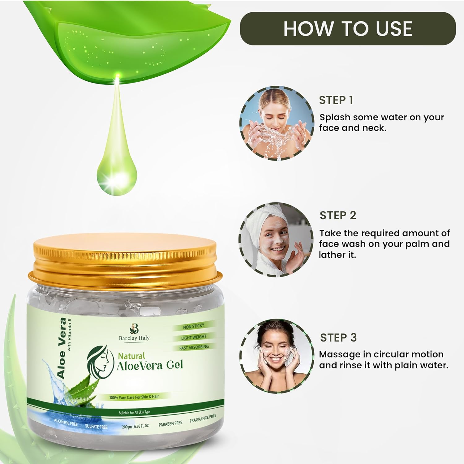 Hydrates dry skin, soothes acne, pimples, and sunburn while nourishing scalp and hair. Enriched with Vitamin E for deep repair, dandruff control, and soft, shiny hair. Lightweight, fast-absorbing, non-sticky aloe vera gel for daily skin and hair care for men and women.