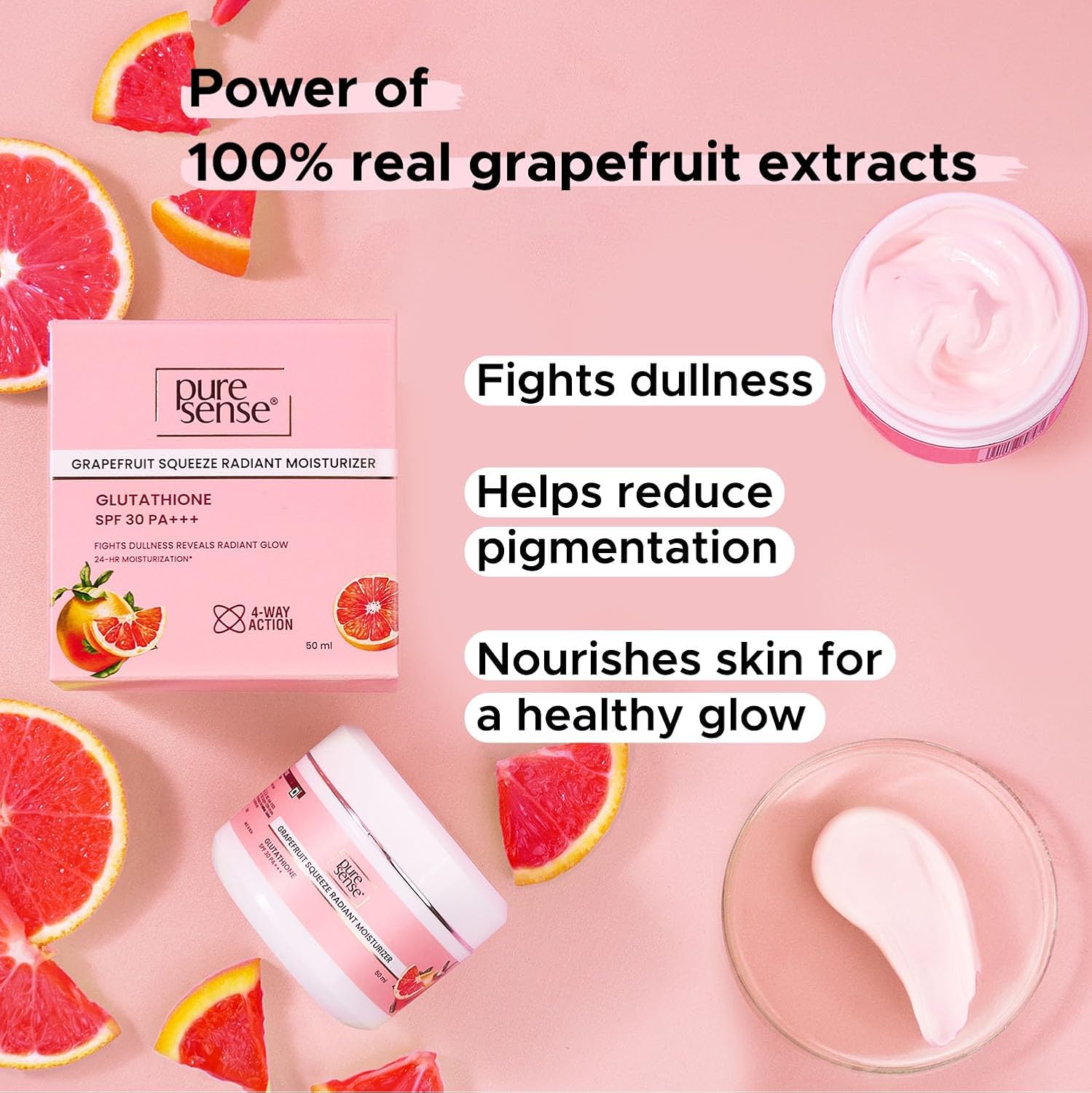 PureSense Grapefruit Squeeze Radiant Moisturizer with Glutathione and SPF 30 PA+++ is powered by a 4-way action formula, this moisturizer not only provides sun protection but also fights dullness, revealing a radiant glow