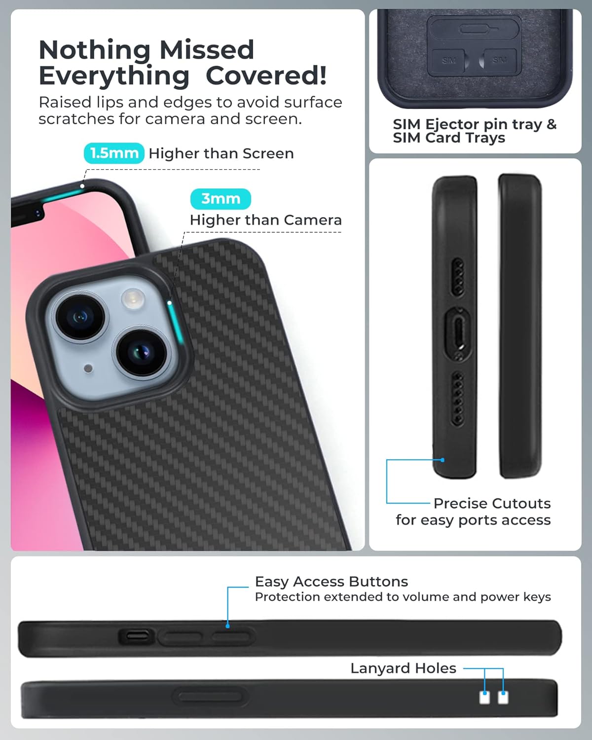 Air pack shock absorption : This real aramid carbon fiber cases reinforced corners are equipped with air pack shock absorption technology which absorbs and disperses the force through TPU .This case also has raised lips at the corners and edges on both sides TPU protect the front and back from scratches when kept flat.