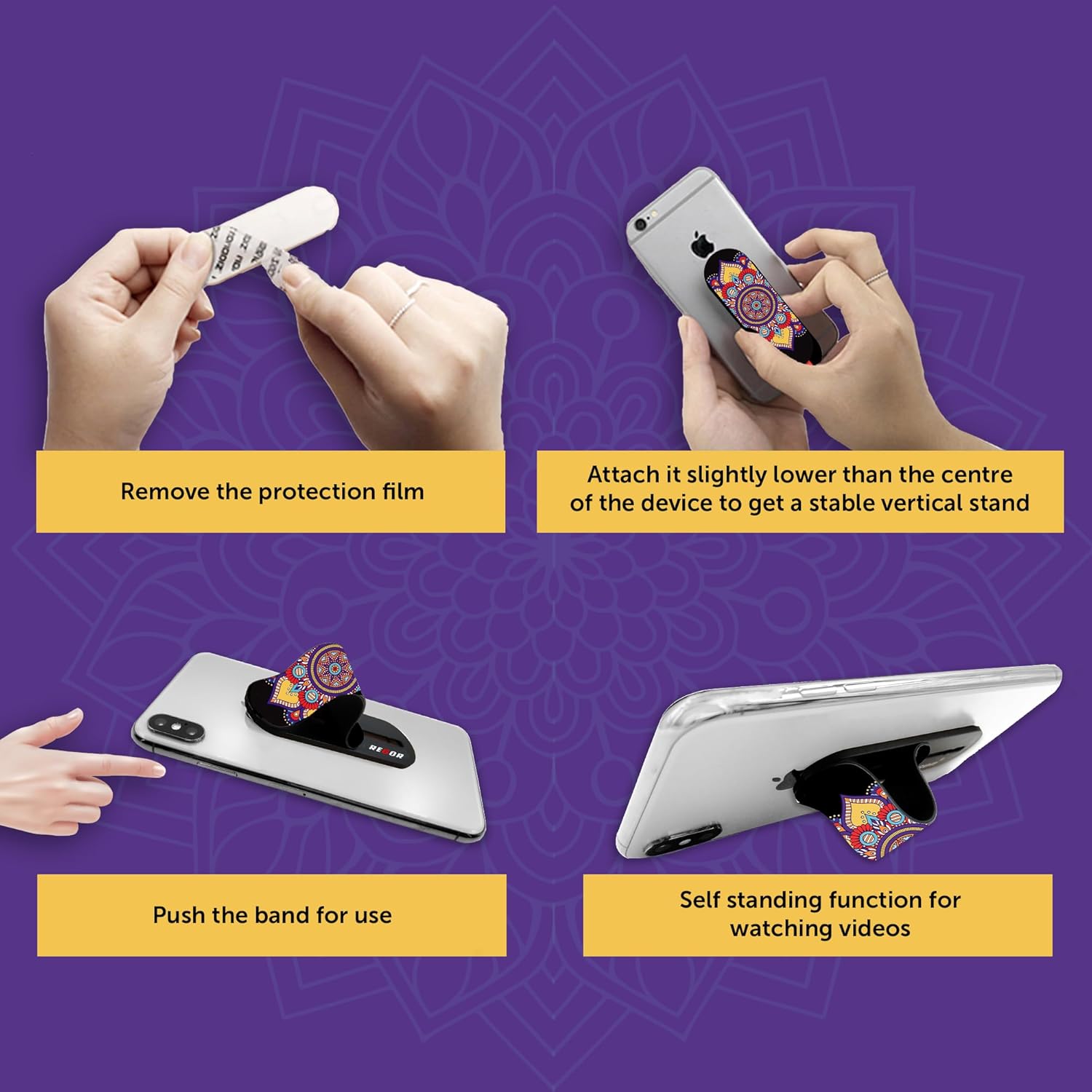 ⭐ Perfect mobile back holder grip to pop your selfies. Browse through our designs for the perfect phone grip holder for boys or for a cute phone holder for hand for girls. Regor mobile holder stand has a special glue which sticks to your phone cover and is a stylish mobile phone stand & one of the most unique mobile phone accessories for girls or boys.