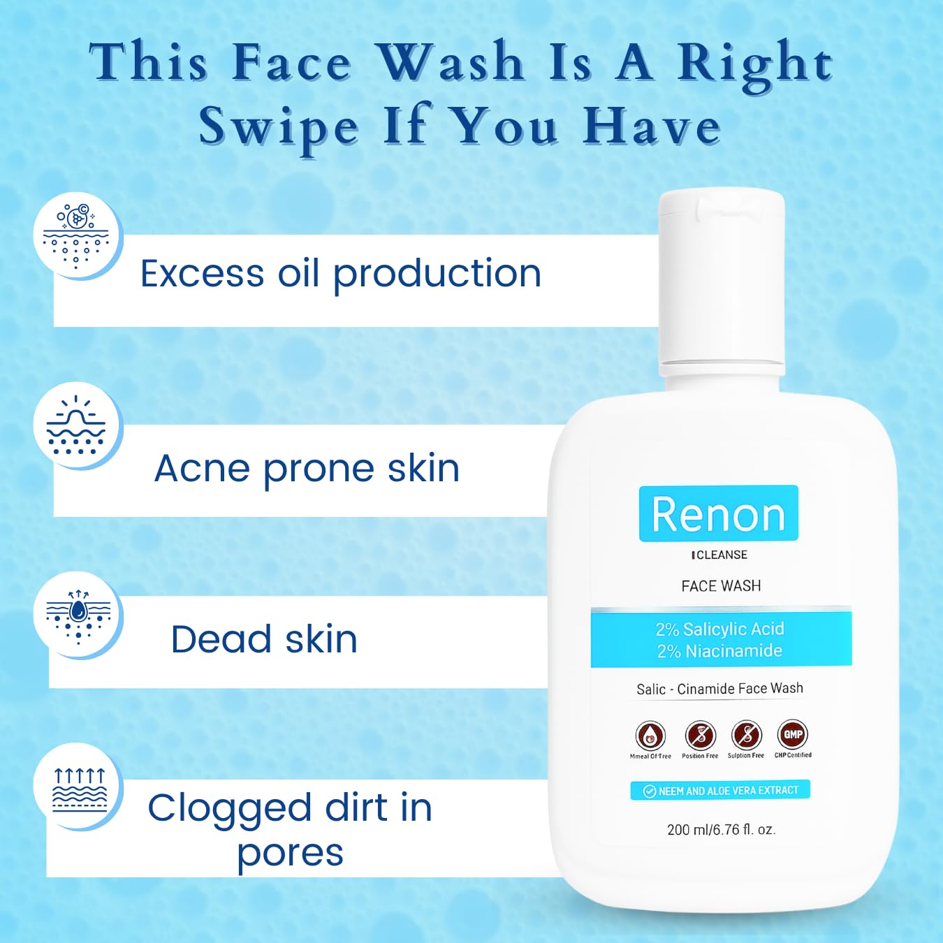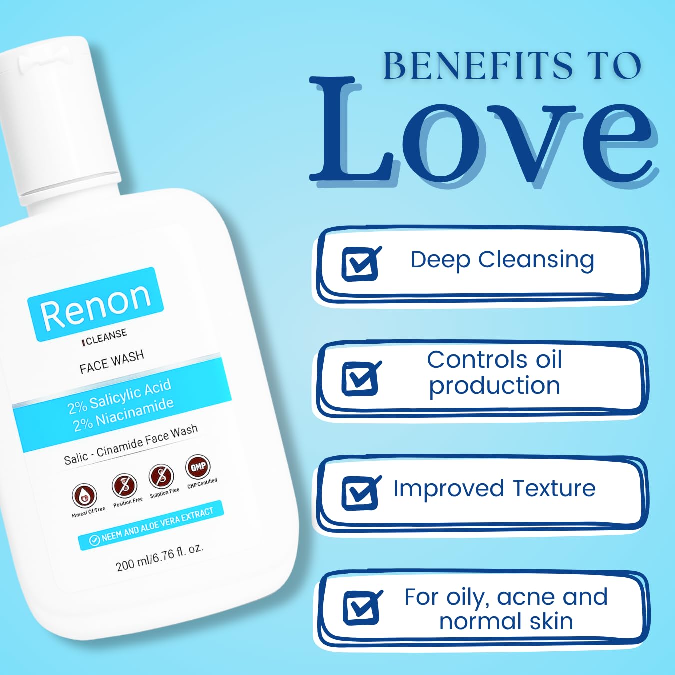 Renon Cleanse 2 % Salicylic acid and 2 % Niacinamide facewash with goodness of Neem and Aloe vera extract is a complete package for removing oil and dirt from the face. This face wash is vegan, cruelty-free, silicones free, parabens free, gluten-free, mineral oil-free and dye-free. REMOVES EXCESS OIL: Say goodbye to excess oil as our face wash works its magic, leaving your skin feeling fresh, clean, and free from shine. Salicylic acid soothes the skin in general, addresses exfoliation-related irritation, easily penetrates your pore lining, and gets rid of clogged-up dirt, debris, and sebum for clear and softer skin. Wheraeas Niacinamide benefits therapeutic, protective, and hydrating properties that reduce the impact of environmental damage, tighten skin, visibly minimize enlarged pores, fight premature signs of aging, and improve skin tone Historically, neem has been used to treat acne, reduce blemishes, and improve skin elasticity Best for Oily to acne prone skin