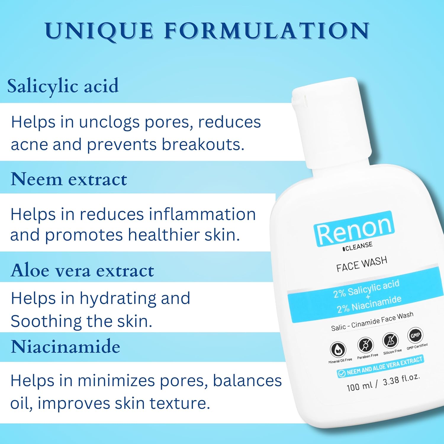 Active Ingredients Featuring a potent blend of salicylic acid, niacinamide, neem extract, and aloe vera extract, this face wash is designed to tackle multiple skin concerns. Salicylic acid is known for its deep pore-cleansing properties, unclogging pores by removing excess oil, dirt, and dead skin cells. Niacinamide helps reduce acne, and inflammation, while balancing oil production, making it ideal for individuals with oily or acne-prone skin. Lastly, aloe vera and neem extracts work to hydrate and soothe the skin, ensuring a gentle yet effective cleansing experience that improves skin texture.