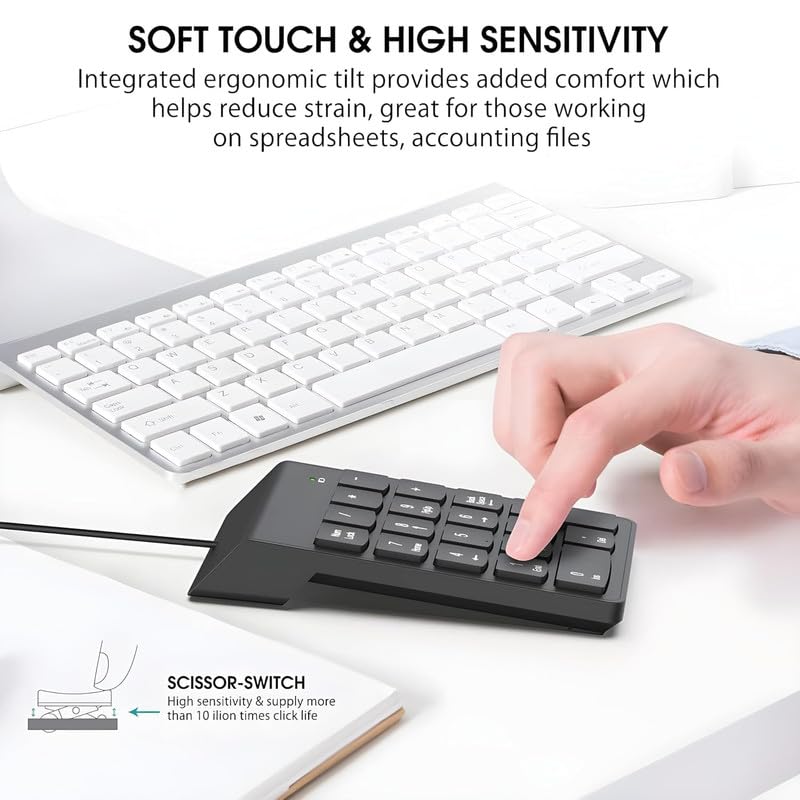 The ergonomic key layout provides a comfortable typing experience, reducing strain on your fingers and wrists during extended use. The responsive keys ensure fast and effortless number entry, making calculations and data input quick and efficient. Whether you’re a data analyst, financial professional, or student, this numpad offers a convenient and intuitive design that enhances your workflow and productivity.