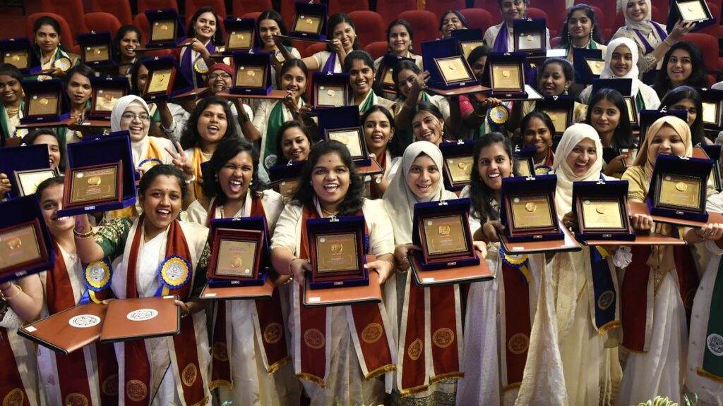 Gold Medalists at the 2nd and 3rd convocation of Maharani Cluster University, held at the Jnanajyothi Auditorium in Bengaluru on Friday.