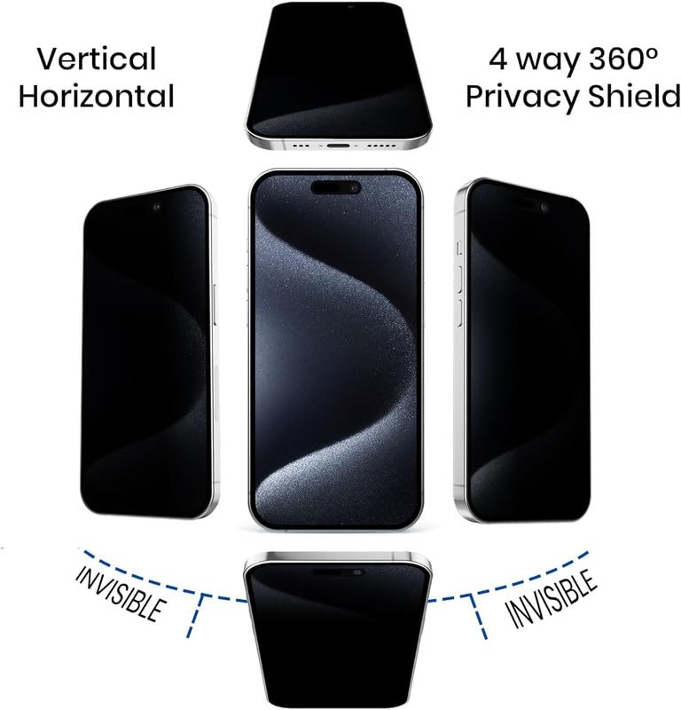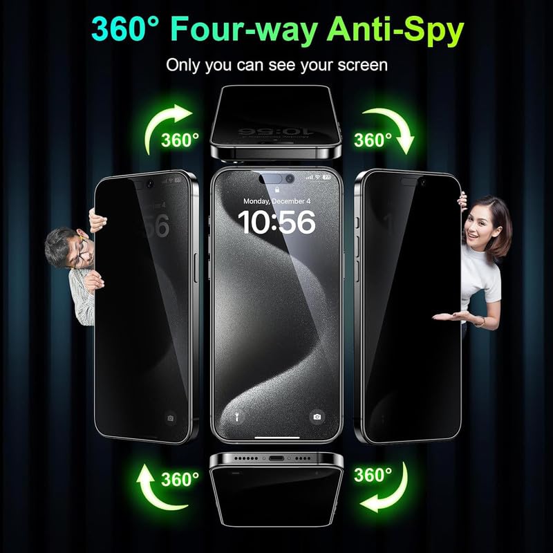 【True 360° Anti-spy Protection】- Screen is only directly visible proof).4-way Anti-spy Screen Protector for iPhone 15 Pro Max will ensures complete privacy from ALL angles, preventing side-angle viewing of the screen.Safeguard your sensitive information and maintain confidentiality in public spaces.