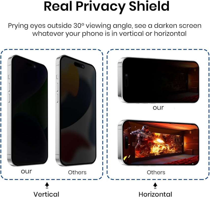 【Reliable Quality】- This privacy iPhone glass screen protector is coated with a hydrophobic and oleophobic clear layer with 9H hardness tempered glass, protecting your iPhone’s screen from daily wear and tear like accidental scratches, small falls, bumps, and even fingerprints and smudges.