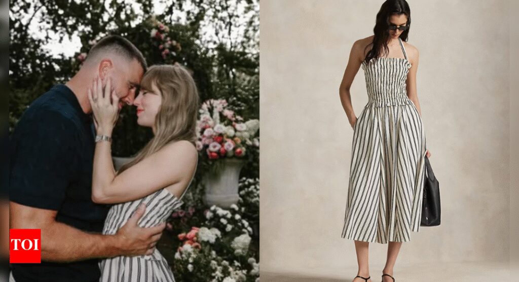 Taylor Swift went engaged, and did it in style. For her garden proposal, she wore the Ralph Lauren Striped Silk-Blend Dress, a mid-length number featuring black-and-white stripes, a smocked bodice, and a breezy A-line skirt. It’s lightweight, summery, and elegant—pretty fitting for what Swifties are calling the start of her “bridal fashion era”.Once the engagement post dropped, the dress became an obsession. Fan accounts, style blogs, and shoppable features traced it to Ralph Lauren, posted links, and flagged restock alerts.The dress originally retailed for $398 but was quickly marked down to around $320, and sold out almost immediately, Harper’s Bazaar reported. As per Teen Vogue, the dress sold out within 20 minutes of the announcement of the engagement, at Ralph Lauren website. “Crafted with a mulberry silk blend for an airy, crinkled hand, this striped dress pairs a smocked bodice and a flowing A-line skirt. The slender shoulder straps can be adjusted or removed for customized versatility,” the website says. As of now, the dress is only available in L, XL and XXL sizes.