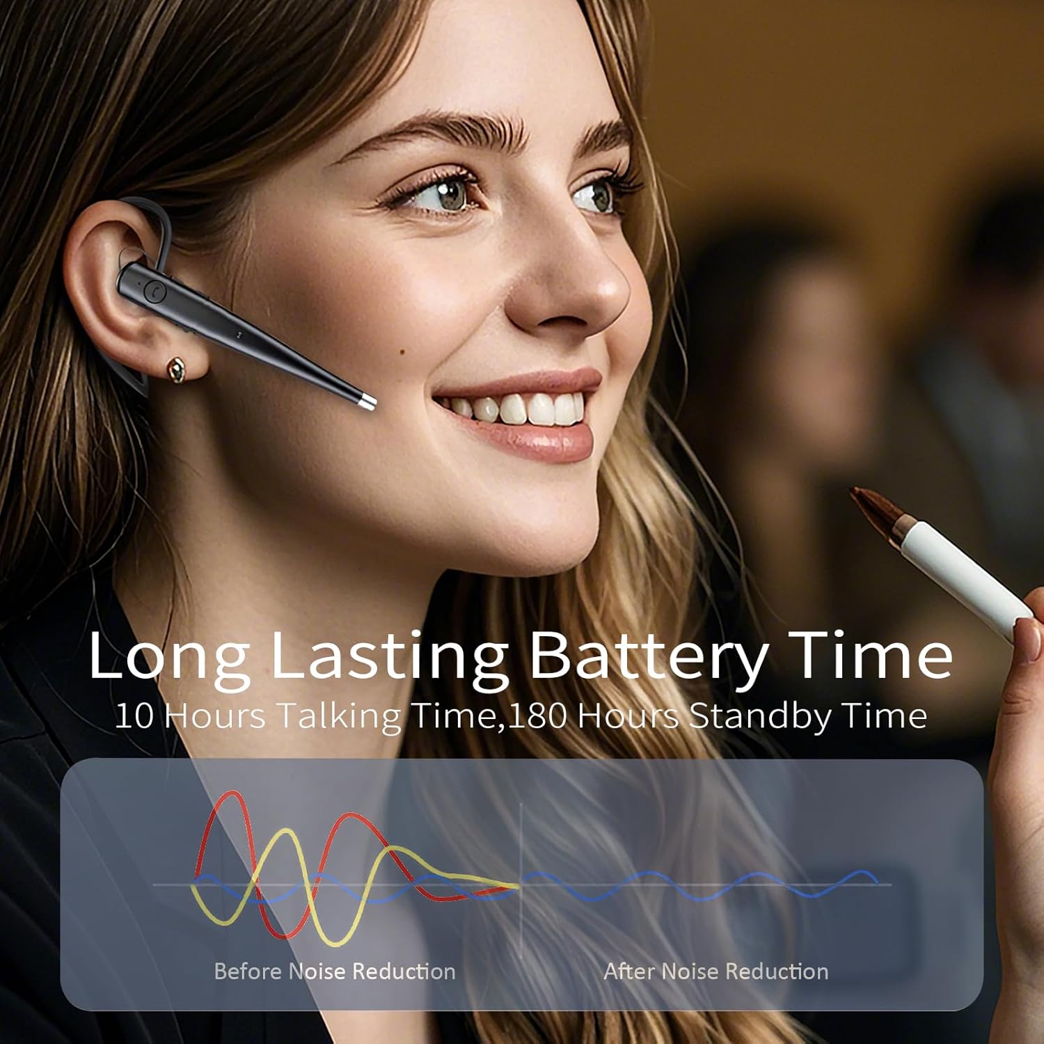 Bluetooth headset with mic exquisite design: unique single-sided style, lightweight design, long time wearing almost no burden, both fashionable and does not affect the perception of the surrounding environment, suitable for a variety of business scenarios.