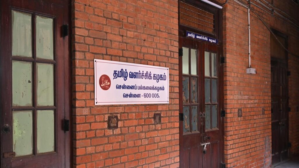 Tamil Valarchi Kazhagam’s nameboard on the Chepauk campus of the University of Madras