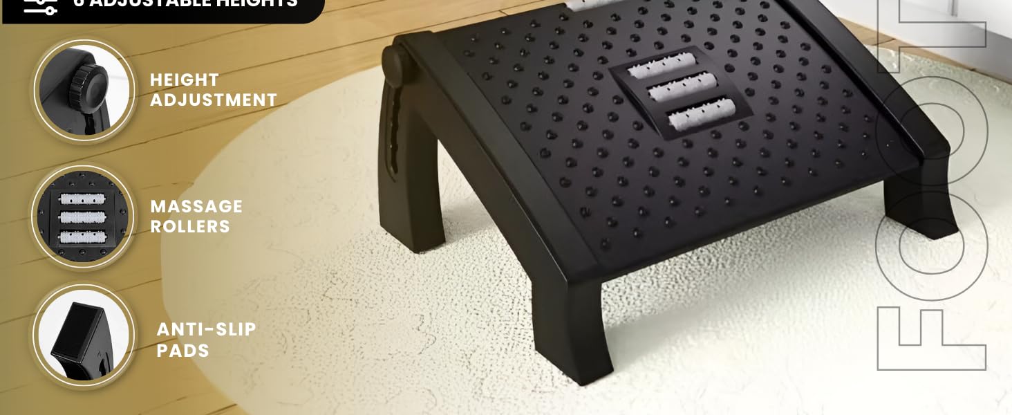 Elevate your office experience with this ergonomic foot rest designed to alleviate discomfort and promote better posture. Featuring a sleek and sturdy construction, it seamlessly integrates with your desk setup. The adjustable height and tilt angles allow you to find the perfect position for your feet, reducing strain on your legs and back. The textured surface provides a secure grip, while the massage nodes offer a soothing massage to improve circulation. Crafted with high-quality materials, this foot rest is built to withstand daily use. Enhance your productivity and comfort with this versatile office accessory.