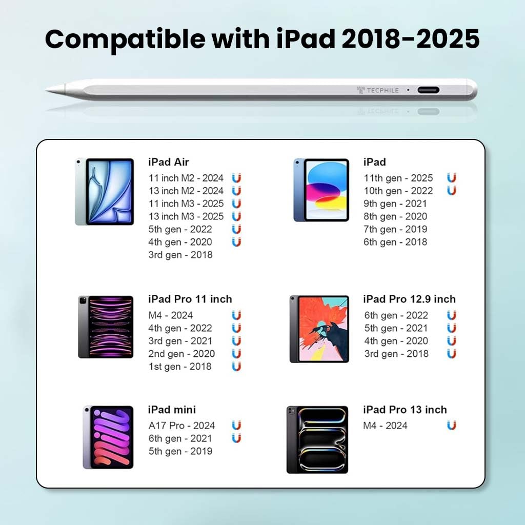 SEAMLESS iPAD PENCIL INTEGRATION & COMPATIBILITY: TECPHILE V1S Upgraded Stylus Pen is designed to work flawlessly with a wide range of iPad models, including iPad (11th, 10th, 9th, 8th, 7th, and 6th generation), iPad Air 2025 M3, M2 (13-inch and 11-inch), iPad mini A17 (7th, 6th and 5th gen), and iPad Pro (13-inch, 12.9-inch, and 11-inch) from 2018 to 2025. Additionally, it supports iOS versions 12.2 and later, ensuring seamless and intuitive writing across all compatible devices.