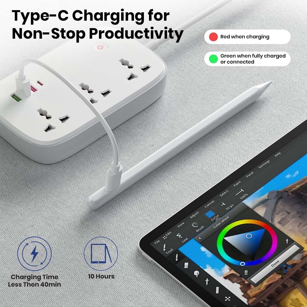 LONG-LASTING POWER & TYPE-C WITH LED INDICATOR: TECPHILE V1S iPad Pencil boasts a 125mAh Li-ion battery, delivering up to 10 hours of continuous use. With our Lightning-Fast Charge technology, you can charge the stylus for just 10 minutes and use it for over 3 hours. The stylus features a convenient Type-C charging port, making it easy to recharge. The auto-sleep mode after 10 minutes of inactivity and auto-shutdown after 1 hour help conserve energy. The battery indicator light makes it easy to monitor power levels: Green when fully charged or connected Red when charging Flashes red when the battery is low