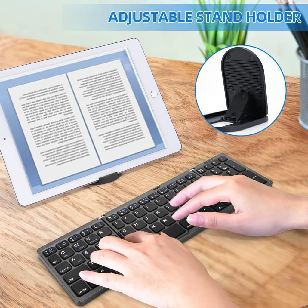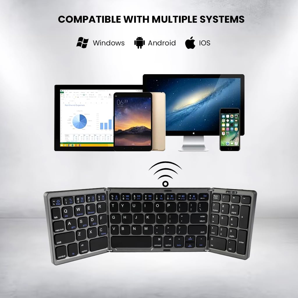 foldable keyboard bluetooth best folding wireless for laptop full size portable usb mini small mobile rechargeable Maximize portability and efficiency with our sleek 3-fold foldable Bluetooth keyboard. Its compact design, secured by a magnetic closure, ensures durability and convenience, making it an ideal on-the-go companion. Effortlessly switch between up to 3 devices with advanced Bluetooth 5.0 connectivity, compatible with iOS, Windows, and Android. The keyboard features an automatic on/off and reconnection design, LED indicators for battery status and caps lock, and a rechargeable battery offering 40 hours of continuous use. Enjoy a clutter-free, efficient typing experience anywhere. Comaptible with iPad (10th Gen), iPad Air M3, iPad Pro M4, Samsung Galaxy Tab S9 FE Plus, Galaxy Tab A9+, Samsung Galaxy Tab S10 Ultra, One Plus Pad, One Plus Pad 2, One Plus Pad Go, Xiaomi Pad 6, Real me Pad 2 / Real me Pad 2 Lite, Redmi Pad SE