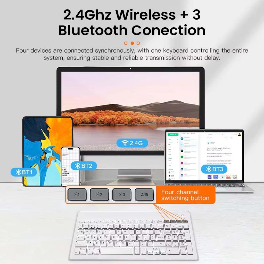 EFFORTLESS KEYBOARD CONNECTIVITY: Enjoy seamless multi-device connectivity with our advanced wireless keyboard, which connects up to 4 devices simultaneously (3 Bluetooth + 2.4GHz USB Dongle). With BT 3.0 and BT 5.0 technology, you’ll experience reliable connections within a 10-meter range. Switching between devices is effortless—simply press “Connect” for the desired device and toggle between BT1, BT2, BT3, and 2.4G channels using the intuitive controls on the upper right corner of the keyboard.
