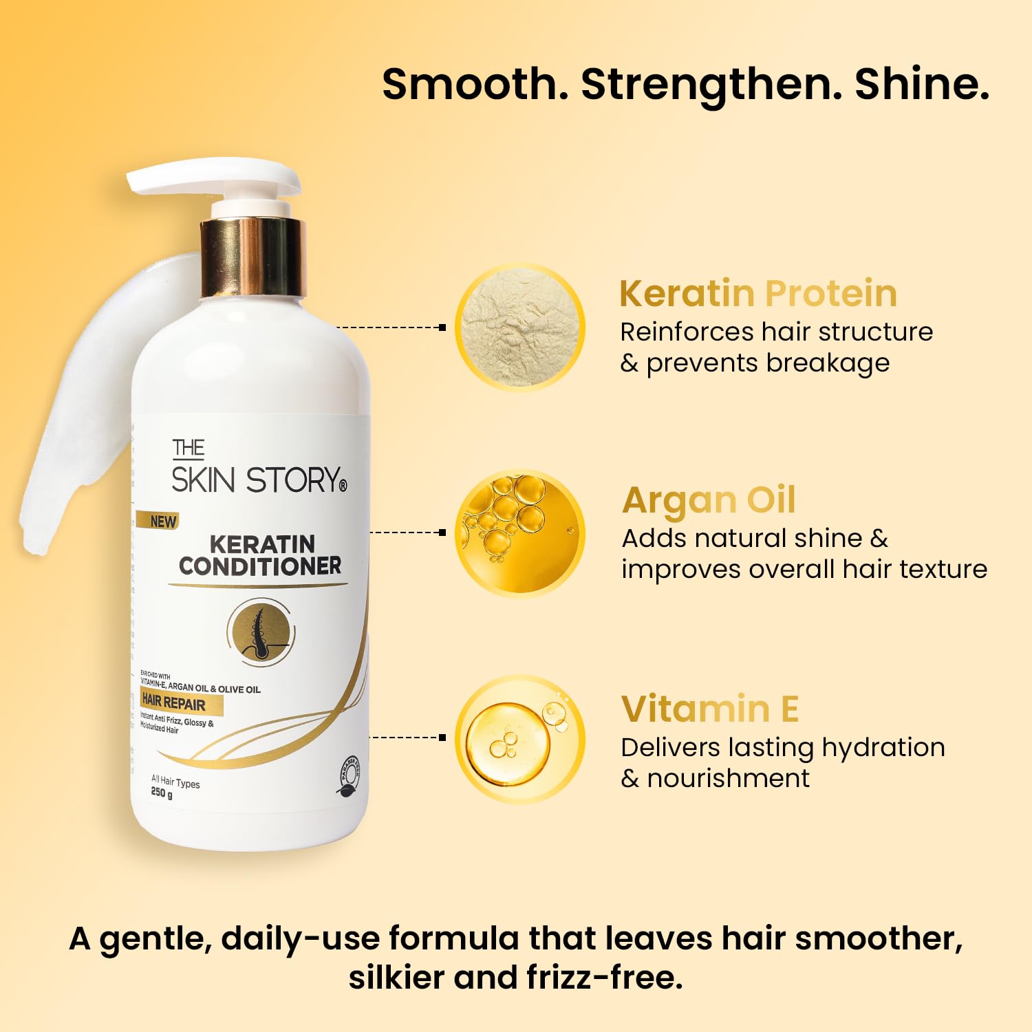 The Skin Story Keratin Smooth Hair Conditioner for Normal Hair | Split End & Damage Control | Long-Lasting Shine for Dry, Frizzy Hair | Sulphate & Paraben Free | Enriched with Vitamin E, Argan Oil & Olive Oil | 250g