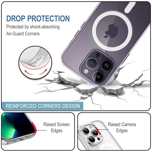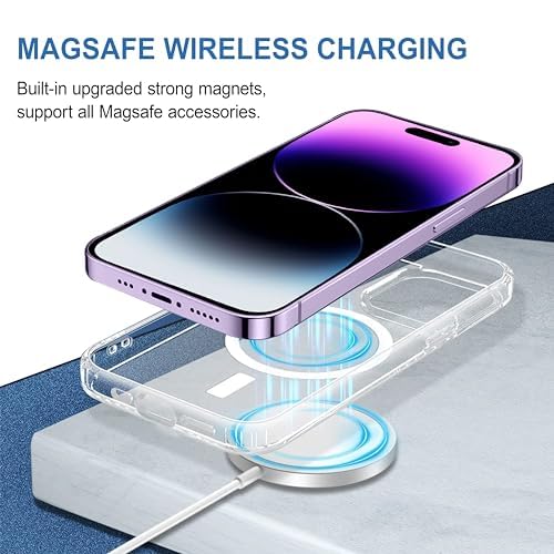 Wireless Charging: Built-in magnets ensure precise alignment for seamless wireless charging. This accessory offers a hassle-free, clutter-free charging experience with a reliable and stable connection every timeShowcase Original Phone: A transparent Mag-Safe mobile cover that highlights your phone’s original color and design while ensuring dependable protection. Featuring a sleek, slim profile and precise cutouts for buttons, ports, and the cameraVersatile Compatibility: This Mag-Safe case turns your phone into a multifunctional accessory hub, seamlessly compatible with various Mag-Safe accessories, including chargers, wallets, rings, car holders, and kickstands Premium Case cover for Apple iphone 14 pro max