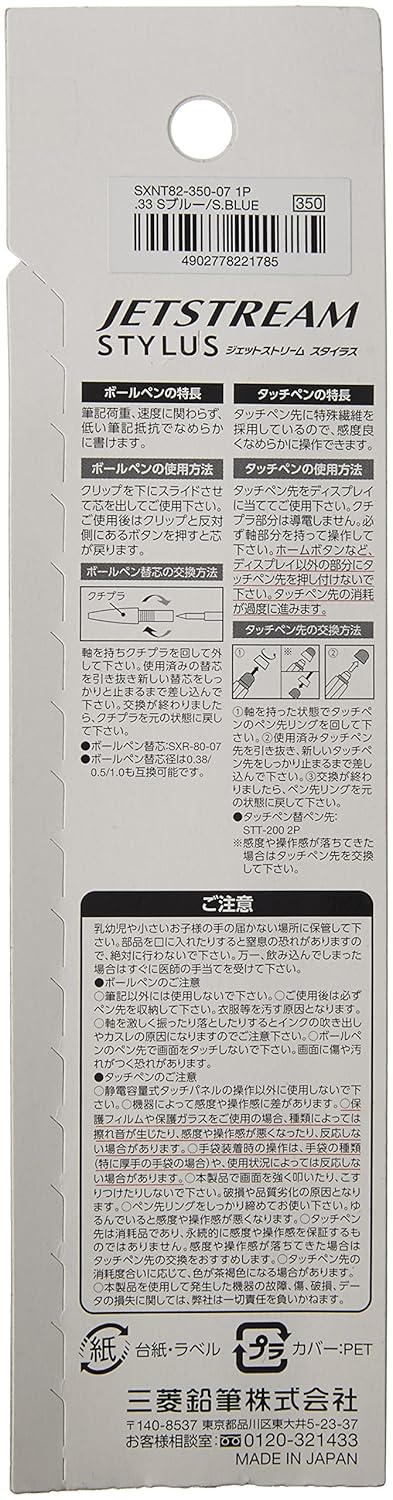 A single color ballpoint pen with a Stylus, “Jetstream Stylus single Knock” has appeared in popular “Jetstream series”! “Jetstream Stylus single Knock” has newly adopted a resin shaft that gives high conductivity. Also the pen tip is equipped with “ag fiber tip” in which very short conductive fibers are implanted, so that it reacts even with light touch by a synergistic effect. The fiber on the surface of the “ag fiber tip” expands and makes contact area with screen, so Reactivity is very good. “Ag fiber tip” is exchangeable. Ink is a “Jetstream” ink characterized by a smooth writing taste and a dark and dense line, with a ball diameter of 0.7mm. Writing resistance is low, so it can be written smoothly, and it is excellent in quick drying.