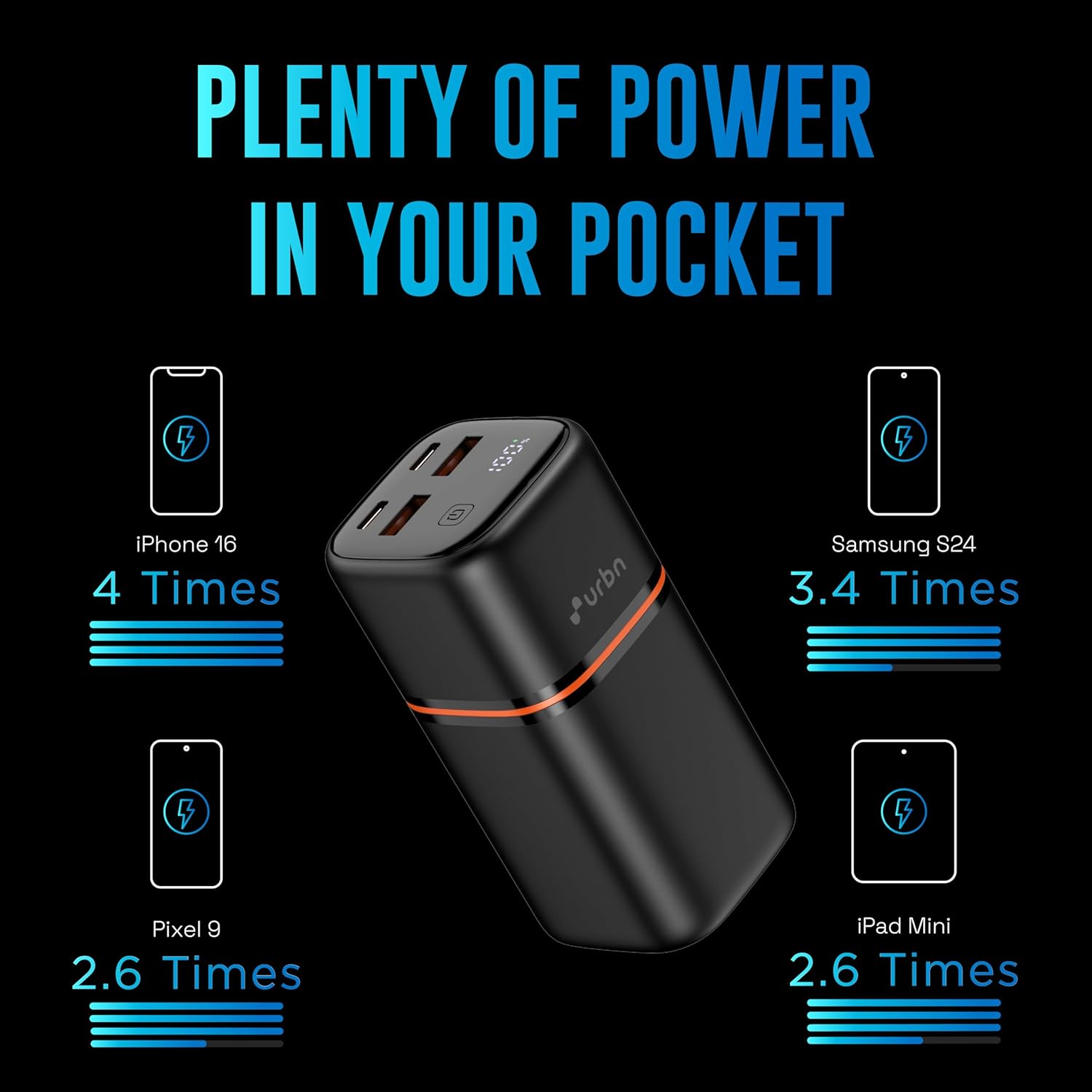 URBN 20000mAh 70W Super Fast Charging Power Bank – Power Like Never Before! Keep all your devices charged with the URBN 20000mAh 70W Super Fast Charging Power Bank – the ultimate power solution for laptops, smartphones, tablets, and more. With quad output, PD compatibility, and two-way fast charging, this powerhouse is built for professionals, travelers, and tech enthusiasts who need uninterrupted power on the go. 🔋 Blazing-Fast 70W Charging – Power Your Devices in Minutes! MacBook Air: 65% in just 30 minutes iPhone 16: 60% in 30 minutes Samsung S24 Ultra: 65% in 30 minutes Whether you’re working, gaming, or traveling, enjoy rapid power boosts for your laptop, smartphone, and more! ⚡ Quad Output – Charge 4 Devices Simultaneously Equipped with 2 USB-C & 2 USB-A ports, this power bank lets you charge multiple devices at once. No more waiting – power up your laptop, phone, and accessories all at the same time! ✅ USB-C PD (Power Delivery) Compatible – Supports high-speed charging for MacBook Air, iPads, iPhones, Androids, and more. ✅ Two-Way Fast Charging – Quickly charge your power bank and devices with ultra-efficient power transfer. ✅ Pass-Through Charging – Charge the power bank while simultaneously charging your devices for maximum convenience. 🔒 Unmatched Safety with 12-Layer Circuit Protection Engineered for safety, the URBN 70W Power Bank features EV-grade lithium-ion cells and 12 layers of protection, safeguarding your devices from overheating, short circuits, overcharging, and more. 🇮🇳 Proudly Made in India – Premium Quality & Reliability Designed and manufactured in India, the URBN 20000mAh Power Bank meets the highest quality standards while supporting local innovation and craftsmanship. 🌍 Compact, Lightweight & Travel-Ready Despite its high capacity, this power bank is slim, lightweight, and easy to carry, making it the perfect companion for remote work, travel, and daily use.