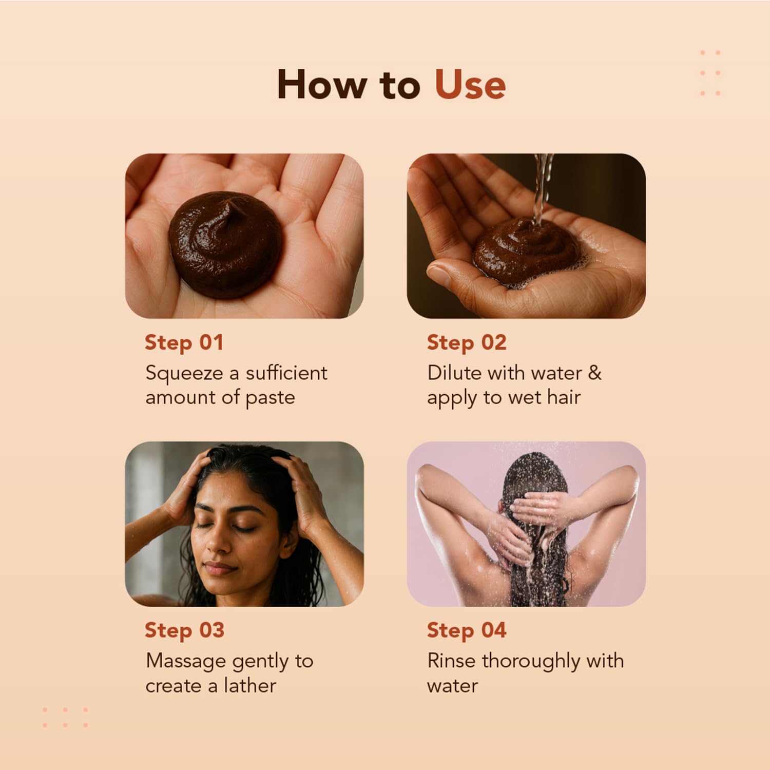 GENTLE HERBAL HAIR WASH: Shikkakai paste enriched with rice ferment filtrate & ceramide complex for smooth, frizz-free, manageable hair.