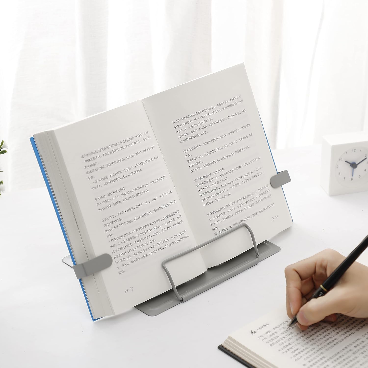 8 Gears Adjustable Kickstand The cookbook holder have six adjustable reading positions,The multiple notches on the backrest can adjust its height and angle.Adjust the height between the eyes and reading books or documents well, and protect the eyes. Let us maintain the correct posture while learning to read to improve our spine health.