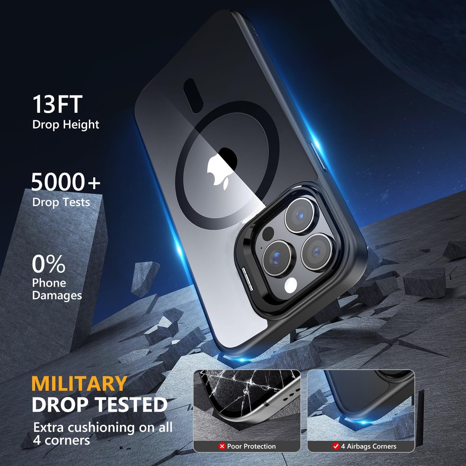 Adjustable Stash Stand: positioned around camera frame to stay hidden when folded away while keeping MagSafe ring 100% unobstructed; enjoy a freely adjustable and stable view for watching shows whenever