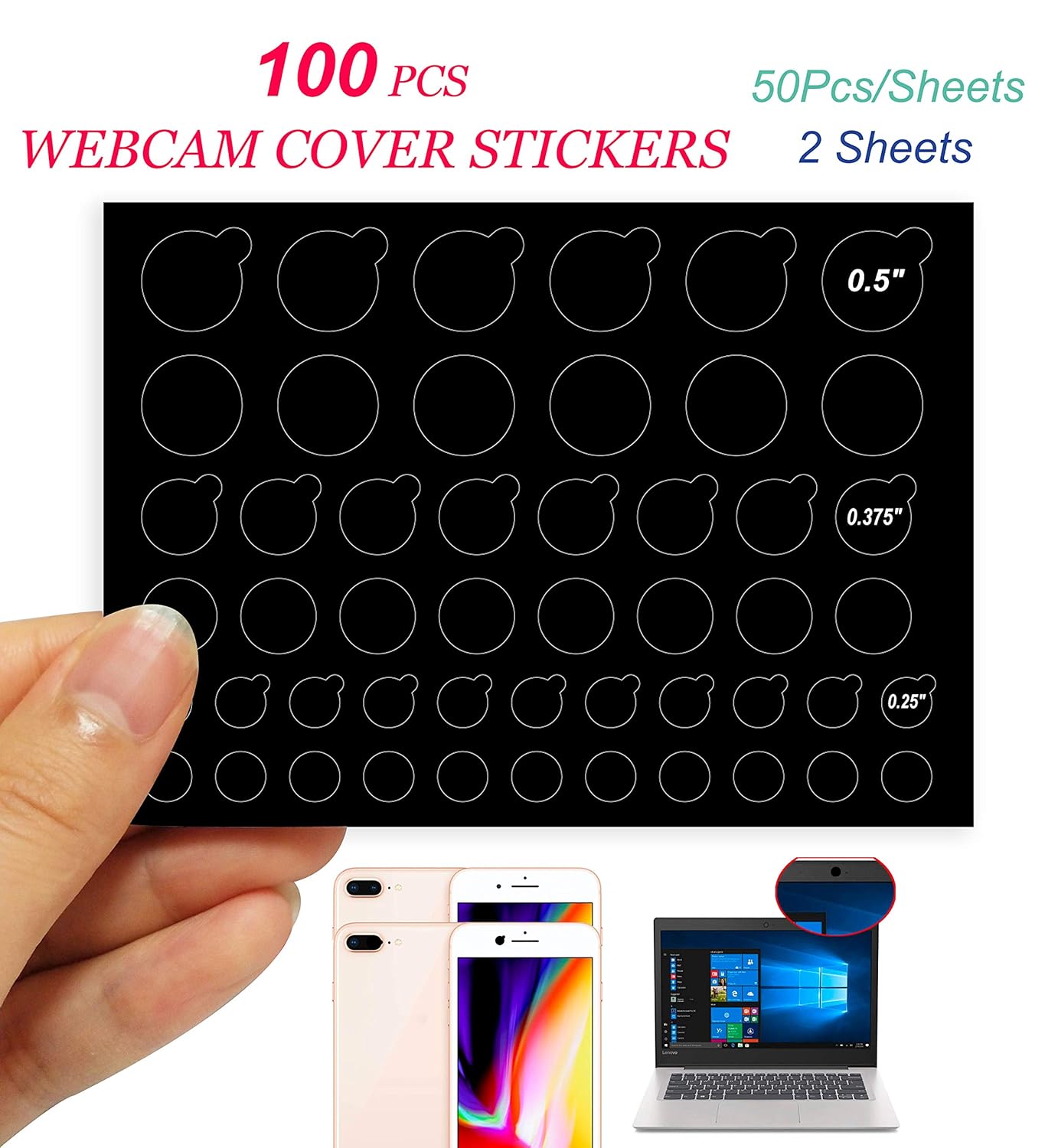 100 PCS Webcam Covers in 3 Sizes 2 Styles – (Circular style 1) 0.5″ x 12,(Circular style 2) 0.5″ x 12. (Circular style 1) 0.375″ x 16,(Circular style 2)0.375″ x 16. (Circular style 1) 0.25″ x 22, (Circular style 2) 0.25″ x 22. Use stickers according to the size of the camera.