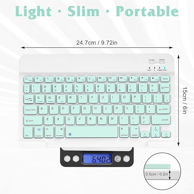 【Ultra Slim & Light】 Small wireless keyboard size is 24.5x15x0.6cm (9.6×5.9×0.2in) and the weight is 185g (6.52oz). Ultra-slim, super light design allow you to put it in the backpack, computer bag, suitcase, to carry anywhere you want, will not take up space or add extra weight. Perfect for anyone who needs a portable keyboard for work or play. Weight: 185g/6.52oz