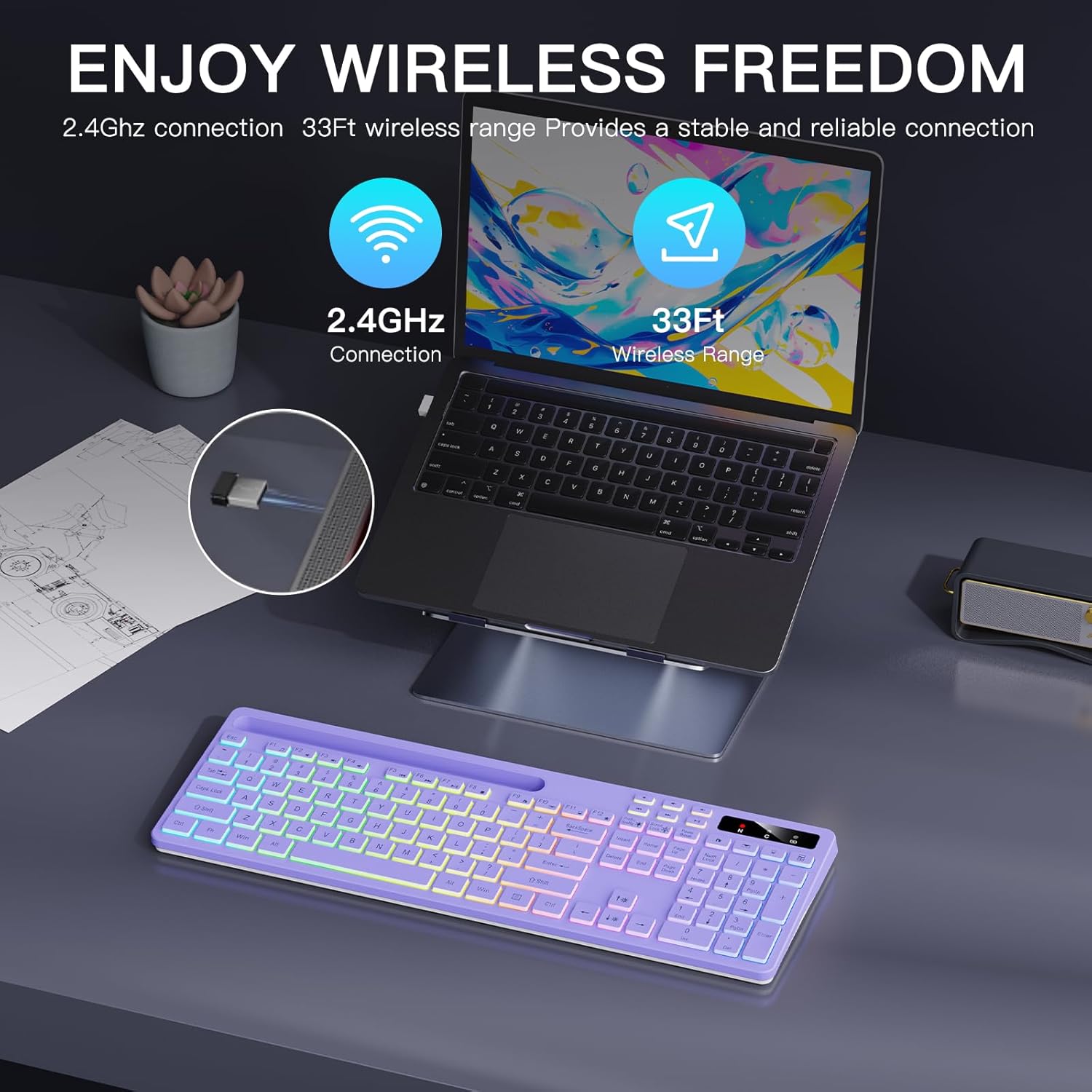The wireless RGB backlight keyboard is quiet, which is ideal for home setup. Wireless keyboard backlit is convenient for you to carry with you at work as well. The full-size keyboard is features a colorful backlight, make it easy to type at night.