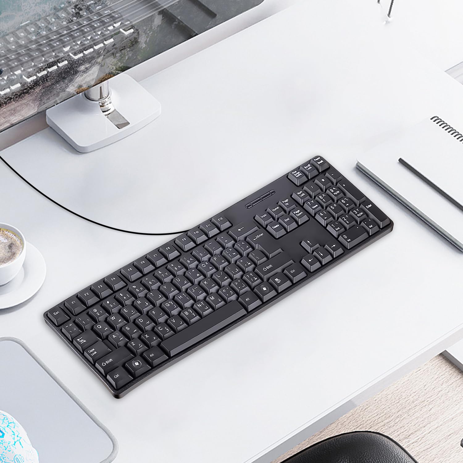 ✅Standard USB Arabic Keyboard – Offers 104 keys, including navigational controls, full functions and a 10-key keypad.